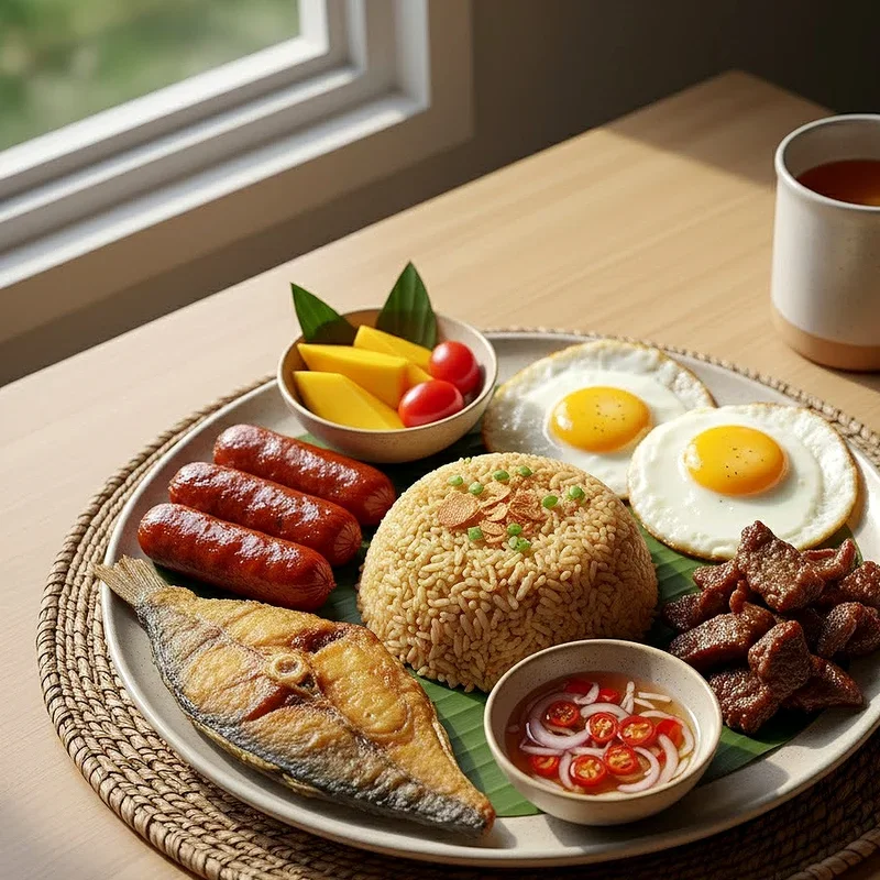 Welcome to the Filipino breakfast philosophy where garlic rice, fried egg, and your choice of protein create endless delicious combinations called "silog." Whether you choose tapsilog with beef, longsilog with sausage, or tocilog with sweet pork, each version brings its own personality to your brunch table. The garlic fried rice forms the foundation, its aromatic presence tying everything together while the runny egg yolk creates a natural sauce. What makes silog special is its unapologetic heartiness; this isn't diet food but rather a celebration of flavors that fuel your entire day. Add a side of fresh tomatoes and atchara (pickled papaya) to cut through the richness and provide balance. It's the kind of meal that makes you understand why Filipinos consider breakfast the most important meal.