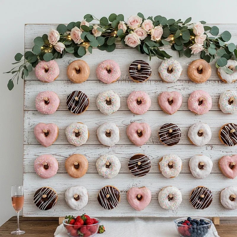Construct a show-stopping donut wall that serves as both dessert station and party backdrop for unforgettable photo opportunities. Hang various donut flavors from pegs on a decorated board, creating an interactive dessert experience guests won't forget. Include glazed, frosted, and filled varieties to satisfy different sweet tooth preferences while maintaining visual appeal through color variety. This trendy display eliminates the need for dessert plates while encouraging guests to grab treats throughout the celebration. Customize donuts with edible flowers, sparkly sprinkles, or themed decorations that tie into your overall party aesthetic perfectly. The vertical presentation maximizes space efficiency while creating an Instagram-worthy moment that extends your party's social media reach. Partner with local bakeries for fresh options or create a DIY station where guests can decorate their own donuts.