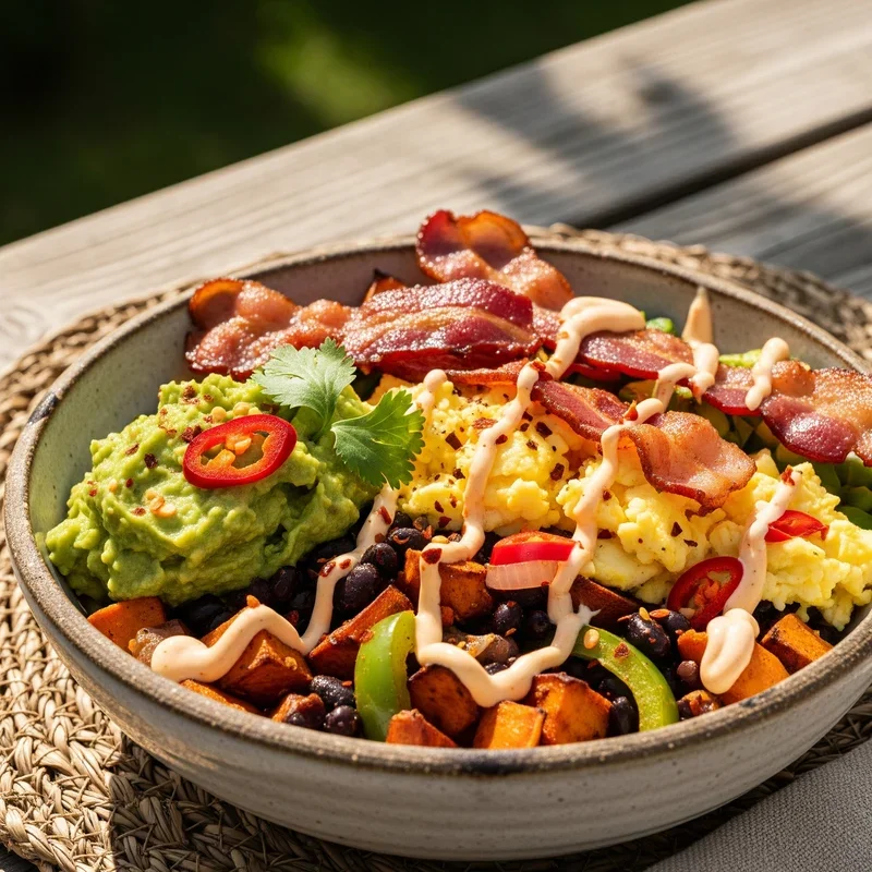 Skip the tortilla and dive fork-first into a breakfast burrito bowl that's loaded with bacon and all your favorite morning fixings. Layer fluffy scrambled eggs, crispy bacon pieces, seasoned black beans, roasted potatoes, and fresh salsa in a bowl for a customizable breakfast experience. The beauty of this deconstructed burrito is that you get all the flavors without worrying about everything falling out of a wrap while you're trying to eat. Top it off with sour cream, shredded cheese, and fresh cilantro for a restaurant-quality meal that's surprisingly easy to throw together on busy mornings. This protein-packed breakfast bowl keeps you satisfied for hours and can easily be meal-prepped for those hectic weekday mornings when time is precious.