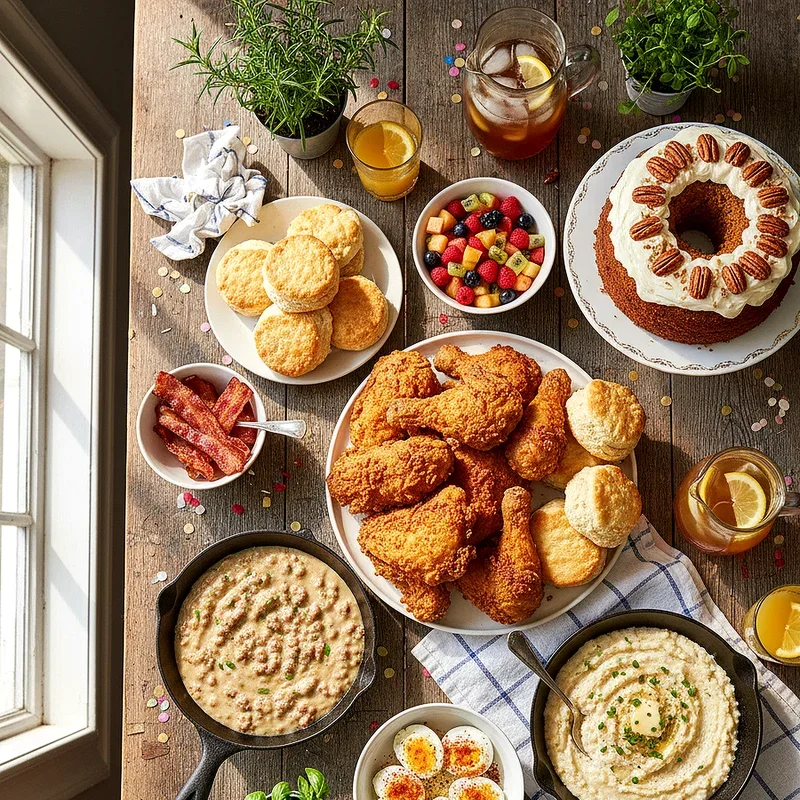 Embrace southern hospitality with a comfort food brunch that wraps guests in warmth and satisfaction from the first bite to the last. Load your table with classics like fluffy biscuits and gravy, shrimp and grits, chicken and waffles, and a hash brown casserole that could win any church potluck. Don't forget the sweet touches like pecan sticky buns and peach cobbler served alongside savory dishes in true southern style. Set the scene with checkered napkins, mason jar drinks, and wildflower arrangements that capture that down home charm. Include plenty of hot sauce options and honey butter for biscuits, allowing guests to customize their heat and sweet levels. This theme creates an atmosphere where everyone feels like family, encouraging seconds and thirds while sharing stories and laughter around the table. The generous portions and comforting flavors make this perfect for birthdays where you want everyone to leave satisfied and happy.