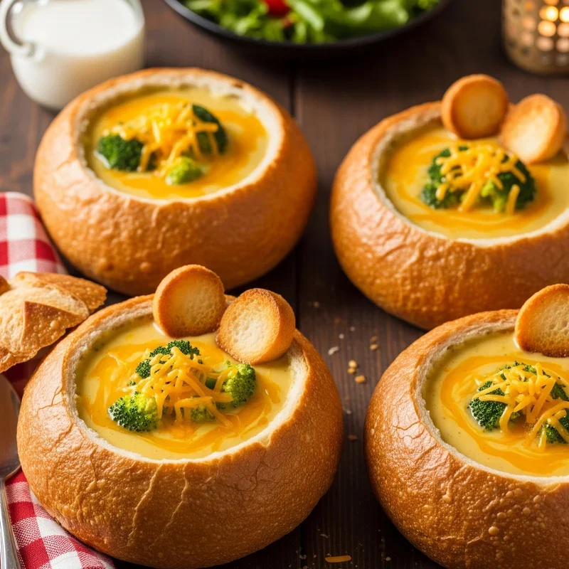 Serve comfort in edible bowls that make this classic soup feel like a special restaurant experience at home! Simmer fresh broccoli in a creamy base enriched with sharp cheddar and a touch of cream cheese. Hollow out sourdough bread bowls, brush with butter, and toast until golden for the perfect soup vessel. The bread slowly absorbs the cheesy soup, creating incredible flavor in every bite you tear off. Kids who typically refuse vegetables happily eat broccoli when it's swimming in cheese this good. Add bacon bits or ham chunks for extra protein that makes this soup hearty enough for dinner. The presentation alone makes family members put away their devices and focus on dinner. Nothing beats dunking that crusty bread into thick, cheesy soup on cold evenings!
