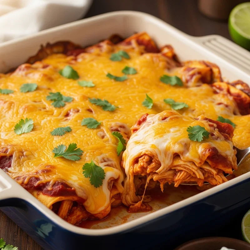 Skip the rolling and create this deconstructed enchilada casserole that delivers all the flavors with half the work! Layer corn tortillas with shredded rotisserie chicken mixed with cream cheese, green chiles, and enchilada sauce. Pile on monterey jack and cheddar cheeses between each layer, creating melty pockets throughout the dish. The casserole method means no broken tortillas or filling spillage that traditional enchiladas sometimes cause. Top with fresh cilantro, sour cream, and sliced avocados for that restaurant-quality presentation at home. Kids who usually avoid spicy food can handle this mild version while adults add jalapeños to their portions. Make it ahead and refrigerate, then bake when ready for those hectic weeknight dinners. This Mexican-inspired comfort food brings everyone together around the table.