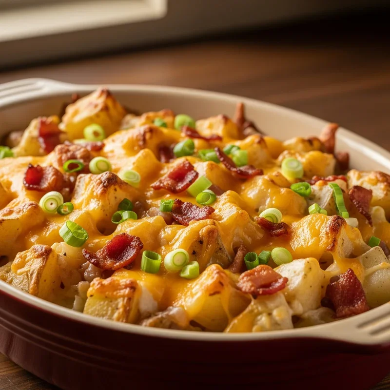 Transform humble potatoes into a cheesy masterpiece that serves as both side and main dish! Layer sliced potatoes with sour cream, cheddar cheese, and cream of chicken soup mixture. Add layers of bacon, green onions, and more cheese for that fully loaded baked potato experience. The casserole format means everyone gets equal amounts of toppings in every serving. Bake until potatoes are tender and the top develops that irresistible golden crust. Kids who claim they don't like potatoes quickly change their minds with this version. Make it even heartier by adding ham or ground beef between layers. This comfort food classic satisfies the pickiest eaters while being budget-friendly!