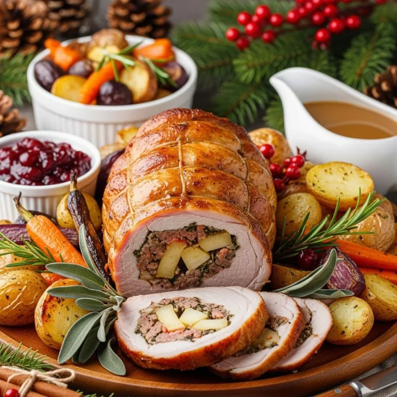Imagine slicing into a perfectly roasted pork loin to reveal a spiral of savory stuffing that looks as good as it tastes. This show-stopper combines the natural sweetness of pork with tart apples, earthy sage, and aromatic onions. Butterfly your pork loin, then spread a mixture of sautéed apples, breadcrumbs, fresh sage, and caramelized onions before rolling and tying it. The transformation during roasting is pure magic: the pork stays juicy while the stuffing melds into a cohesive, flavorful center. A simple pan sauce made with apple cider and butter ties everything together beautifully. This dish brings comfort food to elegant heights, proving that Christmas lunch can be both impressive and approachable. Your guests will think you spent hours in the kitchen, but really, it's simpler than wrapping presents.