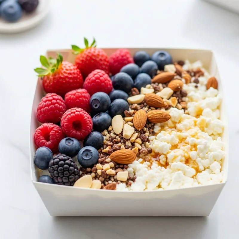 Elevate humble cottage cheese into sophisticated, protein-rich breakfast boxes that deliver approximately 24 grams of protein while keeping calories around 280 per container. This no-cook preparation takes less than five minutes to assemble yet provides complete nutrition to start your day. I arrange 3/4 cup of low-fat cottage cheese as the protein-rich centerpiece (delivering approximately 21 grams of protein alone), surrounded by compartments of fresh berries, sliced cucumber, cherry tomatoes, and a tablespoon of roasted, unsalted nuts. This savory-sweet combination provides textural variety and comprehensive nutrition—quality protein, healthy fats, fiber, and antioxidants—in a visually appealing package. Unlike many breakfast meal preps that feel repetitive by mid-week, these boxes maintain their appeal through the perfect balance of protein-rich creaminess, fresh produce crispness, and nut-derived crunch. The versatility of cottage cheese works beautifully with both sweet accompaniments (berries, cinnamon) and savory pairings (everything bagel seasoning, vegetables), allowing for variations that prevent palate fatigue while maintaining the impressive protein-to-calorie ratio.