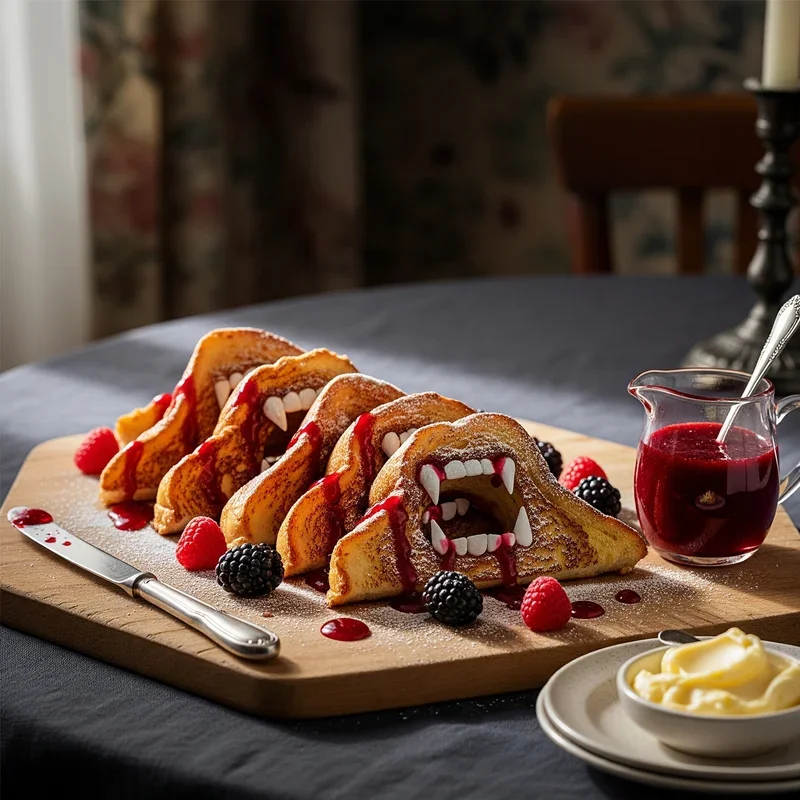 Sink your teeth into this fang-tastic breakfast creation that'll make you feel like you're dining in Transylvania! Cut triangular pieces from thick slices of brioche or challah bread, then dip them in a cinnamon-vanilla egg mixture. Once golden brown on both sides, arrange two pieces to look like vampire fangs on each plate. The "blood" comes from a raspberry coulis drizzled strategically around the fangs. Add sliced strawberries as tongues peeking out between the fangs for an extra ghoulish touch. Mini marshmallows work perfectly as teeth if you want to create a full vampire mouth. This breakfast is rich, indulgent, and perfect for those who want their Halloween morning to start with a bite! Your little vampires will love pretending to grow fangs while enjoying this creative twist on classic French toast.
