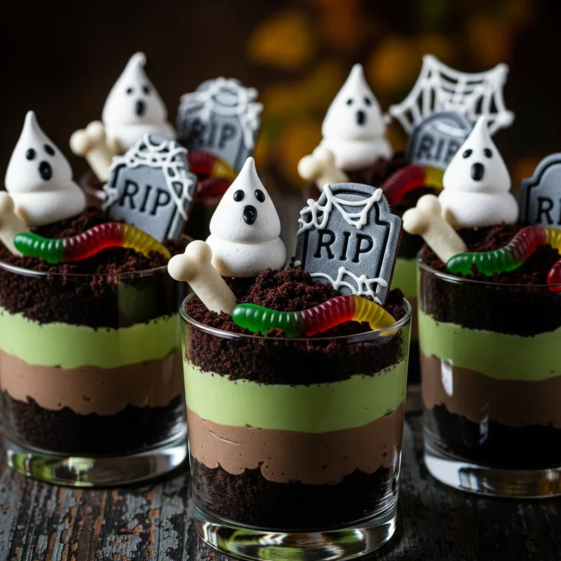 End your spooky breakfast spread with these hauntingly beautiful parfait cups that look like miniature graveyards! Layer chocolate yogurt as "dirt" with granola for texture, alternating with vanilla yogurt "fog" in clear cups. The magic happens on top: crush chocolate cookies for fresh grave dirt, stand rectangular cookies as tombstones (write RIP with icing), and add gummy worms crawling through the layers. Fresh berries become mysterious cemetery flowers, while mint leaves serve as creepy vegetation. These individual portions are perfect for Halloween breakfast parties, allowing guests to dig into their own personal graveyard. The combination of creamy yogurt, crunchy granola, and fresh fruit creates a balanced breakfast disguised as dessert.