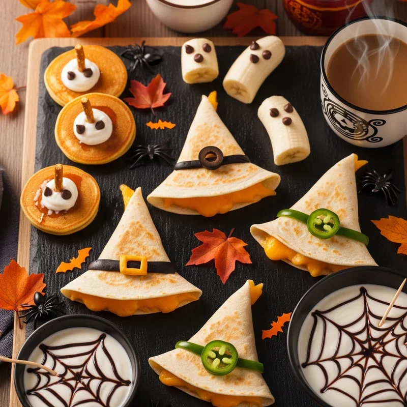 Cast a delicious spell over your morning with these bewitching quesadillas shaped like witch hats! Cut large flour tortillas into triangle shapes, fill with scrambled eggs, cheese, and black beans, then fold and cook until crispy. The pointed shape naturally resembles a witch's hat, but the magic happens in the presentation. Use sour cream to create a buckle design on each hat and sprinkle with paprika for color. Arrange them standing up against each other for a coven of crispy hats, or lay them flat with a side of "potion" salsa verde. The combination of melted cheese and seasoned eggs makes these both satisfying and fun. Your little witches and wizards will love wearing imaginary hats while munching on real ones. Who knew geometry could taste so good at breakfast?