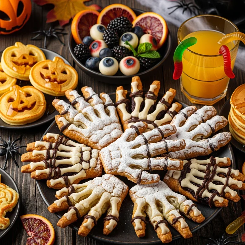 Give your guests a hand this Halloween with these bone-chilling pastries! Roll out puff pastry and cut hand shapes, using a knife to create finger bone indentations. Fill one hand with scrambled eggs and cheese, top with another hand cutout, and seal edges. Before baking, brush with egg wash and use sliced almonds as fingernails. The pastry puffs up beautifully, creating realistic-looking skeleton hands reaching out from your breakfast plate. Serve on a bed of mixed greens as "grave dirt" with marinara sauce for dipping. These flaky, savory hand pies are conversation starters that taste as good as they look. Make different sizes for adult and child skeleton hands, creating a whole skeleton family breakfast. Your guests will be dying to shake hands with these crispy creations!