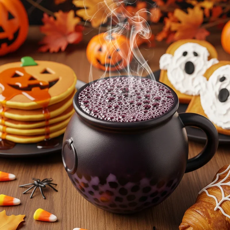 Brew up some morning magic with this mystical breakfast beverage served in mini cauldron mugs! Start with a base of black tea mixed with milk and pumpkin spice syrup. The "bubbles" come from tapioca pearls cooked until translucent and mixed with green food coloring for that witch's brew effect. Add dry ice for safe theatrical smoke (following proper handling guidelines) or use cotton candy that dissolves for a magical transformation. Top with whipped cream and a sprinkle of activated charcoal for that authentic cauldron look. This interactive drink combines the bubble tea trend with Halloween theatrics, creating an experience rather than just a beverage. Serve alongside breakfast for a complete magical morning meal. Your little wizards will love watching their potion bubble and steam while sipping through extra-wide straws!