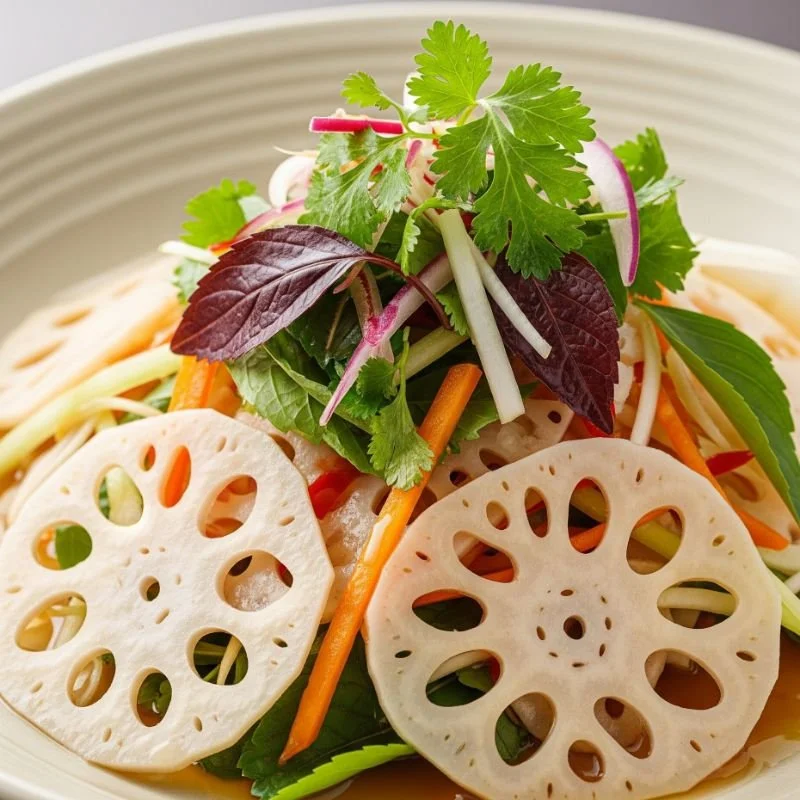 In Vietnamese cuisine, humble ingredients often reveal hidden depths of both flavor and nutrition—none more surprisingly than the lotus root, the crisp, lacy-looking stem of the water lily that forms the foundation of gỏi ngó sen. Sliced into thin rounds that reveal its distinctive pattern of holes (nature's own artistic touch), lotus root provides a satisfying crunch similar to water chestnuts but with a slightly sweeter flavor. Nutritionally, this aquatic vegetable delivers remarkable benefits: rich in vitamin C, B-complex vitamins, iron, potassium, and fiber, while containing compounds being studied for potential anti-inflammatory and digestive benefits. In this refreshing salad, the lotus root typically mingles with poached shrimp or pork, herbs like Vietnamese mint and cilantro, carrots, and a dressing featuring lime juice, fish sauce, and a touch of sugar. The resulting dish offers textural fascination alongside nutritional benefits, with the lotus root's distinctive crunch persisting even after absorbing the flavorful dressing. I find this salad particularly refreshing during warmer months when its light, bright flavors provide satisfaction without heaviness.