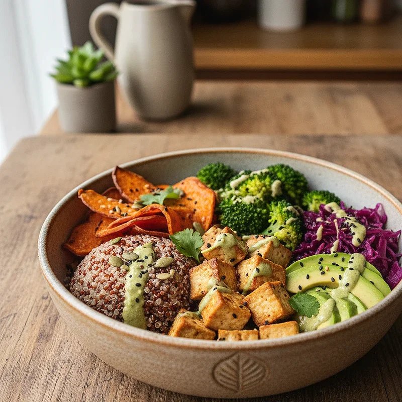 Conclude our journey with this vibrant vegetarian option featuring roasted chickpeas, quinoa, roasted sweet potatoes, steamed broccoli, shredded purple cabbage, carrots, and tahini dressing, proving that plant-based OMAD meals can be incredibly satisfying. This colorful creation provides approximately 1,300 calories with complete proteins from quinoa and chickpeas, along with abundant vitamins, minerals, and antioxidants from the rainbow of vegetables. The variety of textures from crunchy raw vegetables to creamy tahini keeps the meal interesting while providing diverse nutrients. Sweet potatoes offer complex carbohydrates and beta-carotene while the tahini dressing adds healthy fats and calcium. This meal demonstrates that vegetarian OMAD options can be just as filling and nutritionally complete as meat-based meals, offering sustainable choices for various dietary preferences.