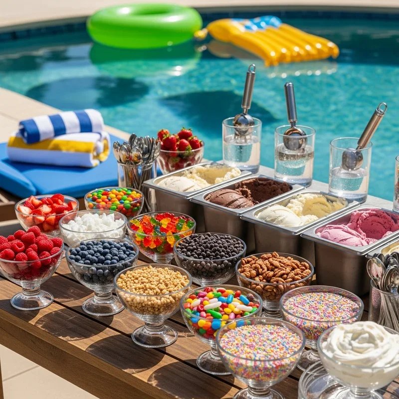 End your pool party on a sweet note with an interactive ice cream sundae bar that lets guests become dessert artists with endless topping combinations. Offer multiple ice cream flavors in tubs nestled in ice to prevent melting, alongside an array of toppings like hot fudge, caramel sauce, sprinkles, crushed cookies, fresh fruit, and whipped cream. This DIY dessert station creates excitement for kids while allowing adults to indulge their inner child with creative sundae combinations they've been dreaming about. Provide both cups and cones to accommodate different preferences, and don't forget the cherries on top for that classic sundae finish. The self-serve format means you can relax while guests happily create their perfect frozen treats to cap off a perfect day.