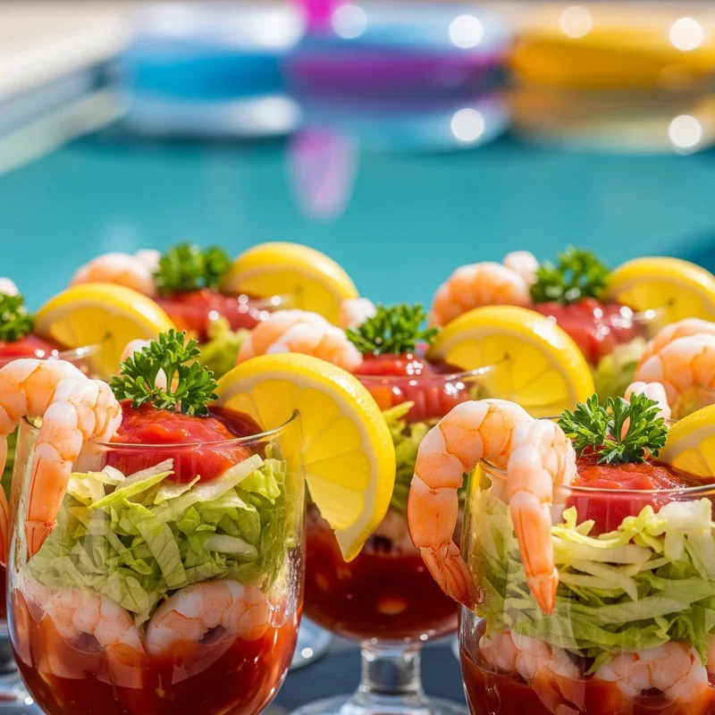 Elevate your pool party with individual shrimp cocktail cups that bring a touch of elegance to casual outdoor dining without the fuss of formal presentation. Layer tangy cocktail sauce at the bottom of clear plastic cups, then arrange chilled jumbo shrimp around the rim for a stunning display that's both practical and sophisticated. These portable portions eliminate the need for communal dipping, making them more hygienic and easier for guests to enjoy while mingling around the pool area. The cold, refreshing nature of shrimp cocktail provides a welcome respite from the heat while delivering lean protein that won't leave guests feeling sluggish. Garnish each cup with a lemon wedge and fresh herbs to add visual appeal and an extra burst of citrus flavor.
