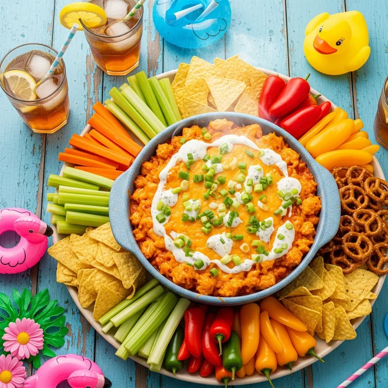 This crowd-pleasing dip brings the addictive flavors of buffalo wings to your pool party without the mess of dealing with bones and dripping sauce. Combine shredded chicken with cream cheese, buffalo sauce, ranch dressing, and plenty of melted cheese for a creamy, spicy dip that'll have guests hovering around the food table. Serve it warm in a slow cooker alongside tortilla chips, celery sticks, and carrot sticks to offer both indulgent and lighter dipping options for different preferences. The familiar flavors appeal to picky eaters while the creamy texture and adjustable heat level make it accessible to everyone from spice lovers to those with milder palates. This protein-packed dip is substantial enough to serve as a meal for hungry swimmers who've worked up an appetite.