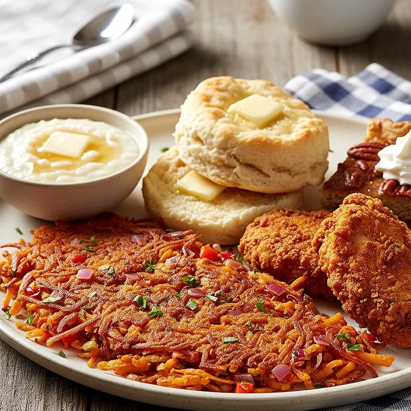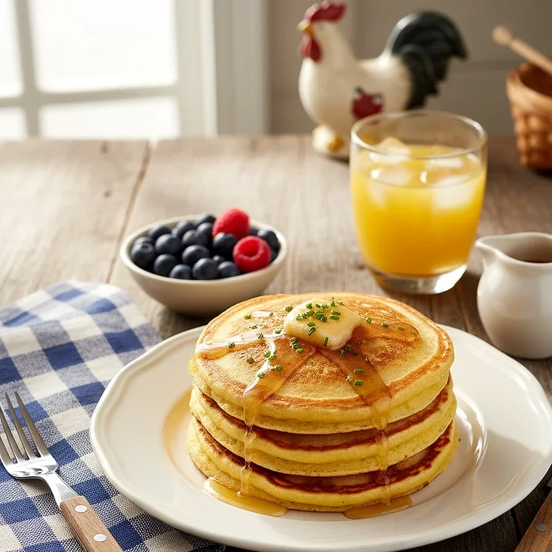Cornmeal pancakes with honey butter showcase the Southern love affair with corn in all its forms, creating pancakes with more character than their plain flour cousins. The addition of cornmeal provides a subtle crunch and nutty flavor that pairs perfectly with the sweetness of honey butter melting into each warm stack. These pancakes have a heartier texture that stands up to robust toppings like country ham or fried apples, making them versatile enough for both sweet and savory preparations. The honey butter, whipped until light and fluffy, adds a touch of luxury that elevates the humble pancake into something special. This dish represents the Southern ability to take indigenous ingredients like corn and transform them into comfort food that satisfies on multiple levels, from texture to taste.