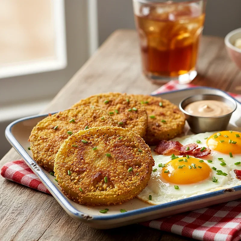 Fried green tomatoes with eggs transform a Southern side dish into a breakfast star, proving that tomatoes don't have to be red to be delicious. Tart, firm green tomatoes get coated in seasoned cornmeal and fried until golden, developing a crispy exterior that gives way to a tangy, juicy interior. Topped with perfectly fried or poached eggs, the runny yolk creates a sauce that mingles with the tomatoes' natural acidity in the most delightful way. This dish celebrates the Southern tradition of using what's available, turning unripe tomatoes into something special rather than waiting for them to ripen. The combination of textures and flavors, from crispy coating to creamy yolk to tart tomato, creates a breakfast experience that's both familiar and unexpected.