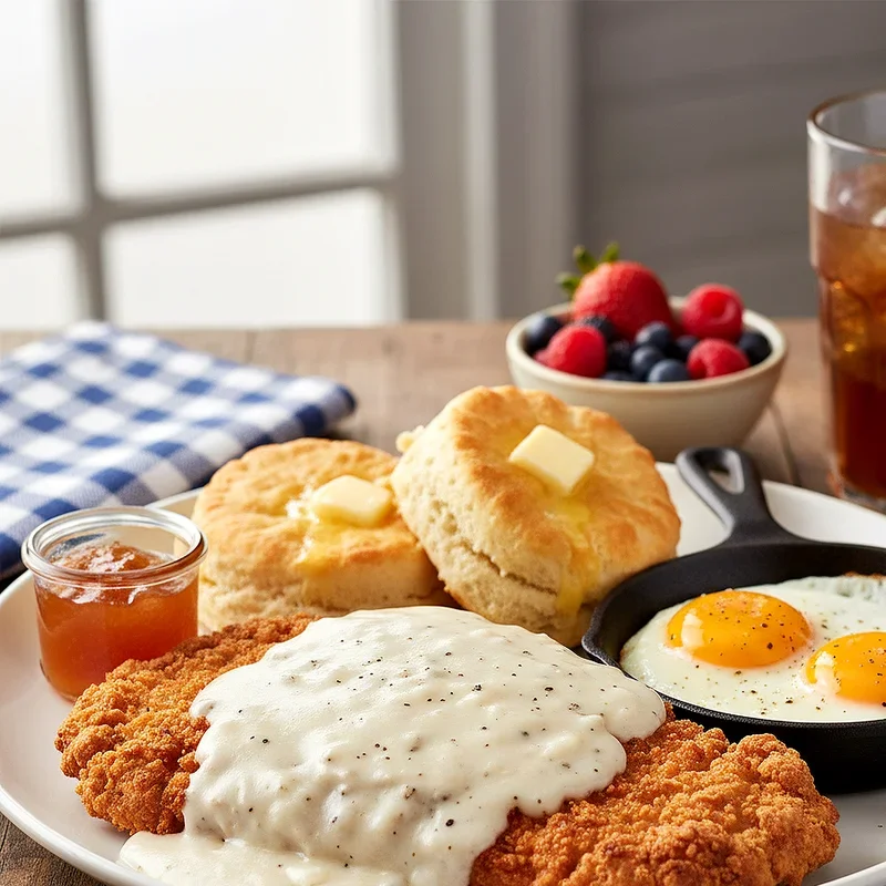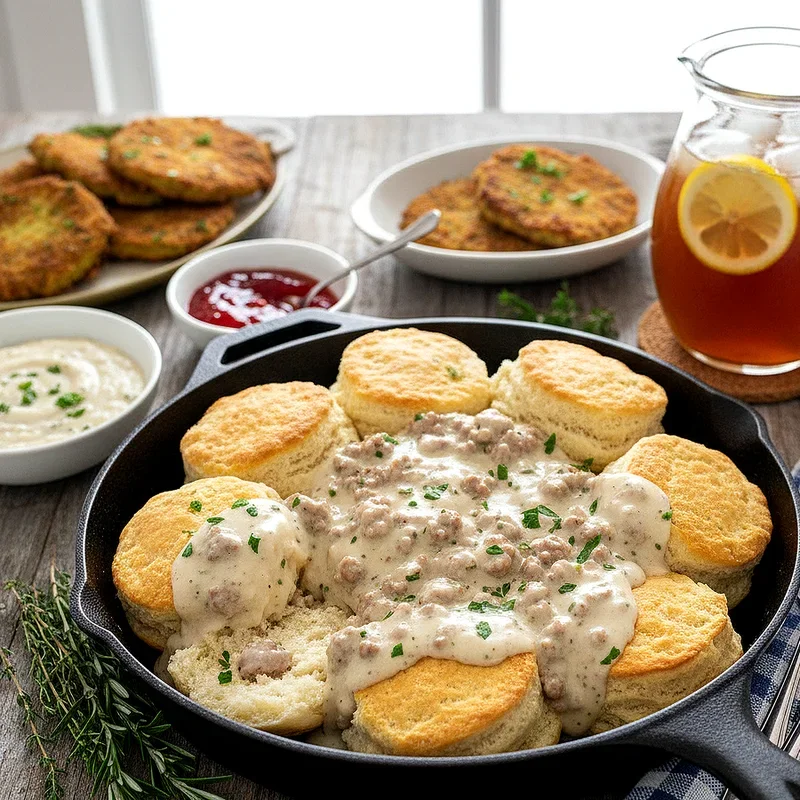 Nothing says Southern brunch quite like flaky buttermilk biscuits smothered in creamy sausage gravy. This iconic combination starts with cold butter worked into flour until the mixture resembles coarse crumbs, then brought together with tangy buttermilk for biscuits that rise tall and golden. The gravy begins with crumbled breakfast sausage browned until fragrant, followed by a roux made right in the same pan, then finished with whole milk that transforms into a rich, peppery sauce. Each bite delivers layers of buttery pastry giving way to savory, well seasoned gravy that coats your mouth with pure comfort. This dish represents the heart of Southern cooking where simple ingredients become something extraordinary through technique and love. Serve these biscuits hot from the oven, split open and drowning in gravy, and watch your guests' faces light up with satisfaction.