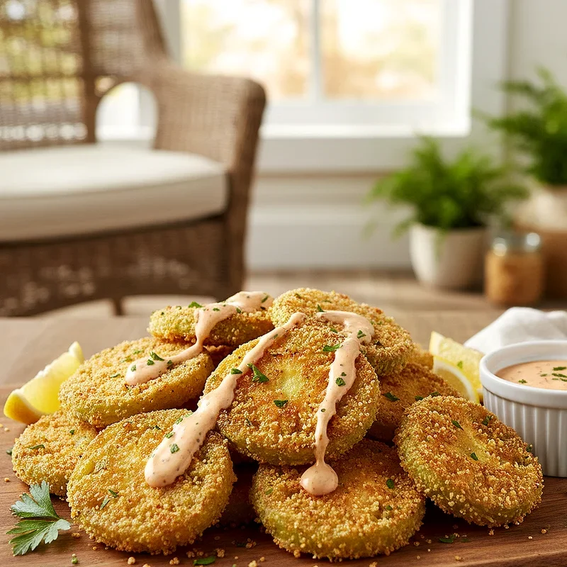 Fried green tomatoes offer a tangy, crunchy brunch component that bridges appetizer and side dish territory beautifully. Firm green tomato slices get dredged through cornmeal and flour seasoned with cayenne and paprika before frying until the coating becomes golden and crispy. The tartness of unripe tomatoes cuts through the richness of fried foods, while the crunchy exterior gives way to slightly firm flesh that still holds its shape. Remoulade sauce, made with mayonnaise, Creole mustard, capers, and hot sauce, provides a zesty companion that elevates each bite. This dish gained fame through movies and novels but has been a Southern staple long before popular culture discovered it. Stack them high on a platter and watch them disappear as guests discover why Southerners have been frying green tomatoes for generations.