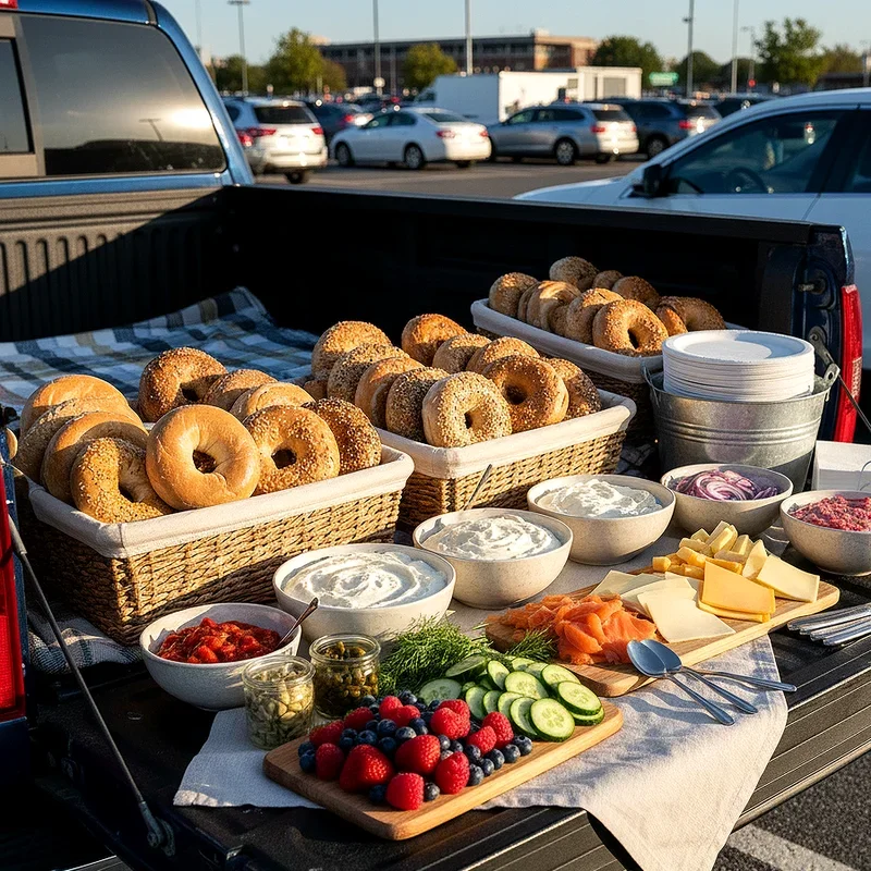 Arrange an impressive spread featuring everything, sesame, plain, and cinnamon raisin bagels alongside various cream cheese flavors and toppings galore. You include both sweet options like strawberry cream cheese with fresh berries and savory choices including herb cream cheese with smoked salmon. Set out sliced tomatoes, red onions, capers, crispy bacon, and cucumber rounds so guests customize their perfect combination. The self-serve format reduces your morning workload while ensuring everyone gets exactly what they want without complaints. Toast bagel halves on the grill for subtle smokiness and those appealing grill marks that elevate store-bought bagels significantly. This versatile setup accommodates various dietary preferences, making it ideal for diverse groups where some prefer light options while others want hearty, protein-packed breakfasts.